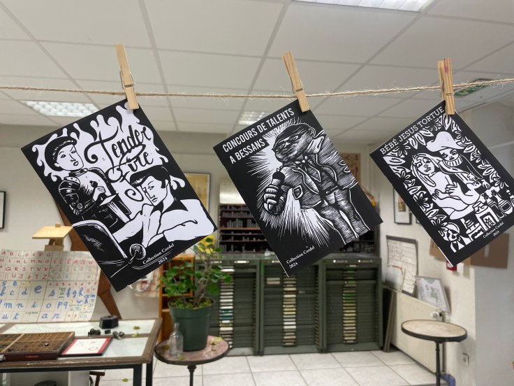 Illustrations en gravure sur linoléum par les élèves de 3ème Pro du Lycée René Perrin d’Ugine inspirés par la visite de l’exposition « 1000 figures? » au centre d’Art et de Rencontres Curiox regroupant les oeuvres d’Hervé Di Rosa et des collections du MIAM de Sète.